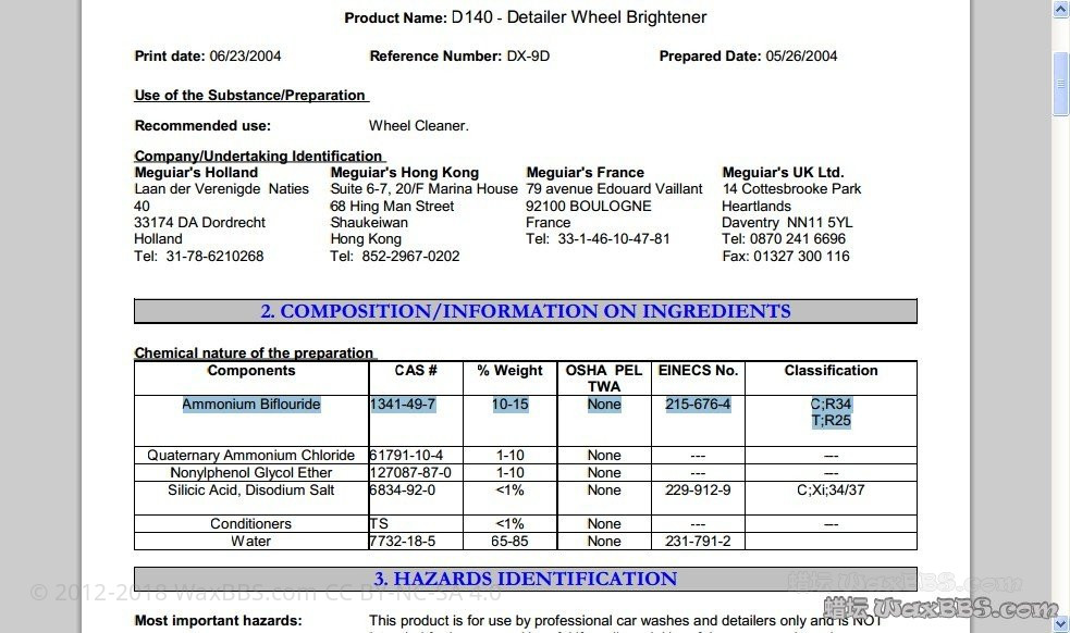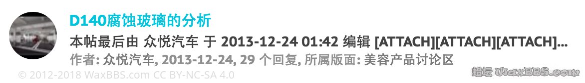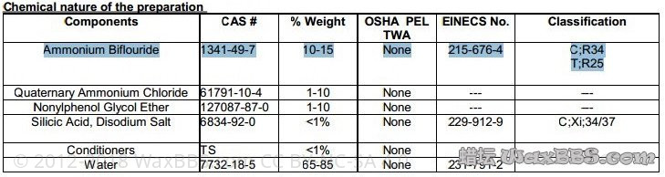 作者: Bearnn: 注:小弟第一次在坛里发帖,有诸多事宜还不是都透彻地理解,坛子里的规则也需要各位大大提点,图一个交流,各位轻拍...... 为什么要开这篇帖子 在坛里潜水已久,虽然很希望能把自己的专业知识用上,但手头也没有找到太过权威的资料不好随便冒泡。不过近日在看到一篇发于新手区讨论除锈剂的帖子,开始关注D140这款产品施于玻璃上时会导致难以去除的痕迹的问题。 浏览附件70531 多方爬文之后发现被D140坑害的坛友真是随处可见,谈及D140使用情况的帖子总会有玻璃腐蚀的问题掺和一下,哀声一片。 浏览附件70532 浏览附件70533 不禁思考为神马一个用来给轮圈和漆面除铁粉的产品会对玻璃造成如此大的影响? 终于找到了一篇神作:http://www.waxbbs.com/forum/threads/d140.1734/ 浏览附件70534 正题开始 楼不高,一共就盖了30层,但是常年搞化学工作的我在其中发现了至宝!一份D140的成分表(虽然是粗略版的,为啥这么粗后面会提)。 如下(此图直接从《D140腐蚀玻璃的分析》一帖另存,请谅解): 浏览附件70535 为了大家看清楚点我把表裁出来: 浏览附件70536 其中第一项已经被原作者选中标出。Ammonium Biflouride,看到这个词我提高了警觉。二氟化氢铵,一种简单氟离子化合物,其氟离子的存在状态与工业常见的玻璃蚀刻剂以及电路板蚀刻剂的活性成分氢氟酸是基本一致的。 以下橙色段落为科普部分,有兴趣看一看: 对化学有了解的人大多清楚玻璃和电路板共同含有的一种元素成分是自然界地壳丰度相当高的非金属——硅。这种元素在自然界主要以硅酸盐和二氧化硅的形态存在,前者在工业生产运用中被加工成为了玻璃和水泥的成分,而后者多见于珠宝店柜台里的水晶,另外还有一个更为重要的应用是制成单晶硅加工为无处不在的电路板和芯片。 由于无论是玻璃加工还是电路板制造,都需要对硅基材料进行物理乃至化学上的加工,因此在工业上一种针对硅进行特定反应的试剂应运而生:氟化氢。这种由天然萤石分解而成的气体在水中约有质量分数40%左右的溶解度,被制成同浓度的水溶液后储存于塑料瓶中,以“氢氟酸”的名字运往各大生产厂商。实际使用时将需要蚀刻的玻璃或硅片部分裸露在氢氟酸中数十分钟至数小时,即可在裸露表面蚀刻掉一层形成新的不规则表面。 化学反应式如下(好久没回顾大一的东西了.....便于理解,反应只体现生成物种类和性质,未进行配平,故仅用箭头表示反应方向) 浏览附件70537 HF——氟化氢 Si——硅片(单晶硅) SiO2——二氧化硅(水晶的主要成分,玻璃虽然是硅酸盐但实际上就是水合的二氧化硅形成的盐,反应生成物没有本质变化,此处以SiO2代替便于理解) SiF4——四氟化硅(常温常压下为气态物质,在水中有一定溶解度但不大) H2——氢气 H2O——水 可见,多数含硅的物质在氢氟酸存在下几乎都会生成一种物质——四氟化硅,这种物质在常温常压下以气体方式离开溶液,就是冒泡泡了~化学工业上这种操作俗称:飞硅。就是把固态的硅变为一种气态化合物“溶解”掉了,灰走了。剩下的就是些其他气体或者水再或者盐类,实现了硅基材质的蚀刻。 不过氢氟酸是一种很特别的酸,它的酸性不算强(和常见的硫、盐、硝三强酸相比),难以迅速地腐蚀常见金属,但唯独因为上述反应产生的四氟化硅“飞走”得太快,所以对硅基材质有相当大的杀伤力。因此它的强腐蚀作用主要不是基于酸性,而是靠氟离子与硅的特殊反应导致。 氟离子对玻璃等硅基材料的特异腐蚀性使其成为玻璃工业和硅工业必不可少的工业原料,常见的形态即为氢氟酸和其他氟离子化合物(例如文中主角二氟化氢铵)。因此如果说D140能够对汽车玻璃材质造成不可逆的表面“模糊化处理”,最大可能的元凶就是成分表中占有最大比例的有效成分——二氟化氢铵(水作溶剂不算有效成分)。不过常言道:“一切不基于剂量的谈毒性都是耍流氓”。是啊,喝水喝多了还水中毒呢,吃盐吃多了也齁死。浓度就只有10~15%能对玻璃有多大腐蚀啊~?是啊,本来我想这个浓度其实并不大的,换算成氢氟酸的话氟离子的等效浓度还得更低呢。但是转念一想,大家把D140喷在漆面上,那么大的蒸发面积,我也还没做过测试,谁知道到底是水蒸发得快还是氟化氢蒸发得快呢。假设要是水蒸发得快一点,那氟化氢不就慢慢被浓缩起来了么,达到一个“毛玻璃”效果也就是时间的问题。众所周知浓硫酸的腐蚀性是很强滴,稀硫酸对于俺们化学专业的来说就很温顺啦,随手溅出来到身上衣服上都不在乎的,不过皮肤上冲一下就好,衣服上要是不洗可就呵呵了,过两天就会发现原来溅上的地方烧出了个窟窿,主要就是因为硫酸在衣服上在水分蒸发的过程中被浓缩了,不过因为硫酸是一种不挥发的酸,而盐酸、氢氟酸等多少会挥发,比硫酸会好很多,不过依然要注意~ 还有一点不得不说: 小弟化学专业出身,如今攻读博士期间,从初中开始就在家疯狂地搞实验,拥有丰富的作死经验,不过在此还是要谨慎地提醒各位撸车友人,任何氟离子都不是好惹的,尤其是存在于酸性环境下的氟离子,形成的氢氟酸对人体有伤害,主要表现在: 1.氟化氢分子和氟离子体积均很小,可以轻松穿透皮肤和组织直达骨骼。 2.氢氟酸酸性较常见强酸较弱,短时接触皮肤没有强烈反应,当发现症状时往往较晚。 3.除直接接触溶液导致的灼伤外,挥发的氟化氢气体对呼吸