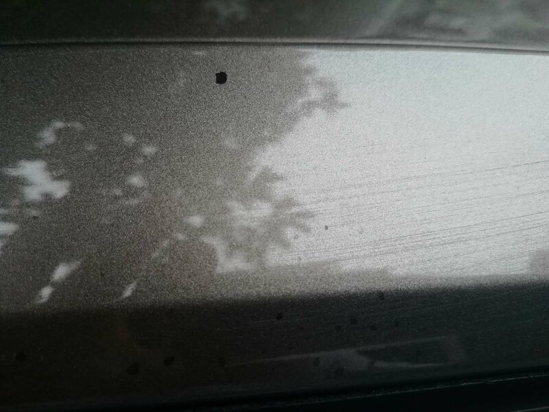 之前的猜测是:前阵子好几天气温有达到35度,中午在太阳下暴晒时车顶温度更加高,这时候如果树胶或者鸟粪跌落车顶,没有及时发现清理,造成腐蚀?