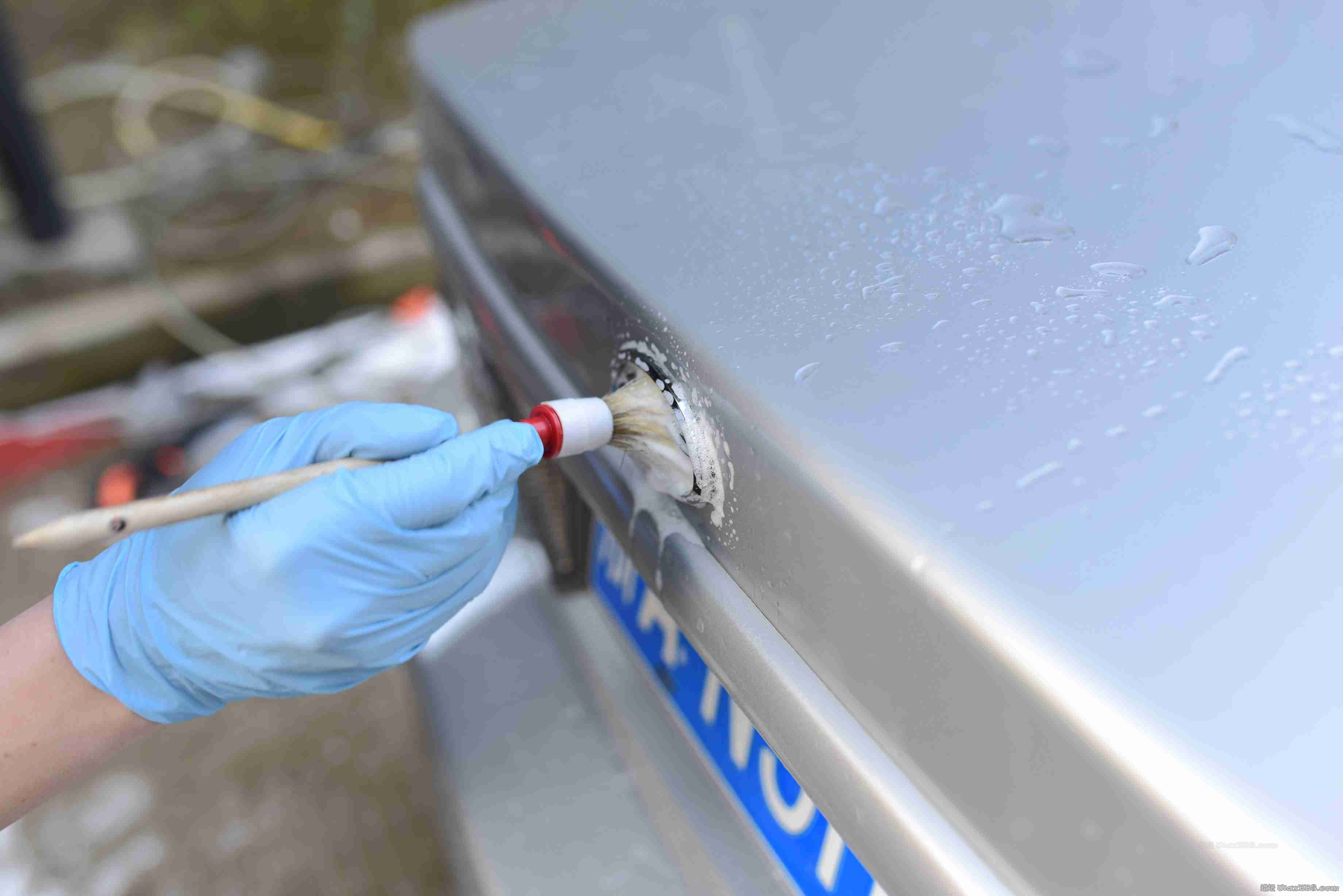 用细节刷刷洗轮毂表面。这一步现在发现容易造成划痕。目前轮毂表面以换为先去铁粉再用薄的洗车手套沾取稀释樱桃爽清洗,效果不错。