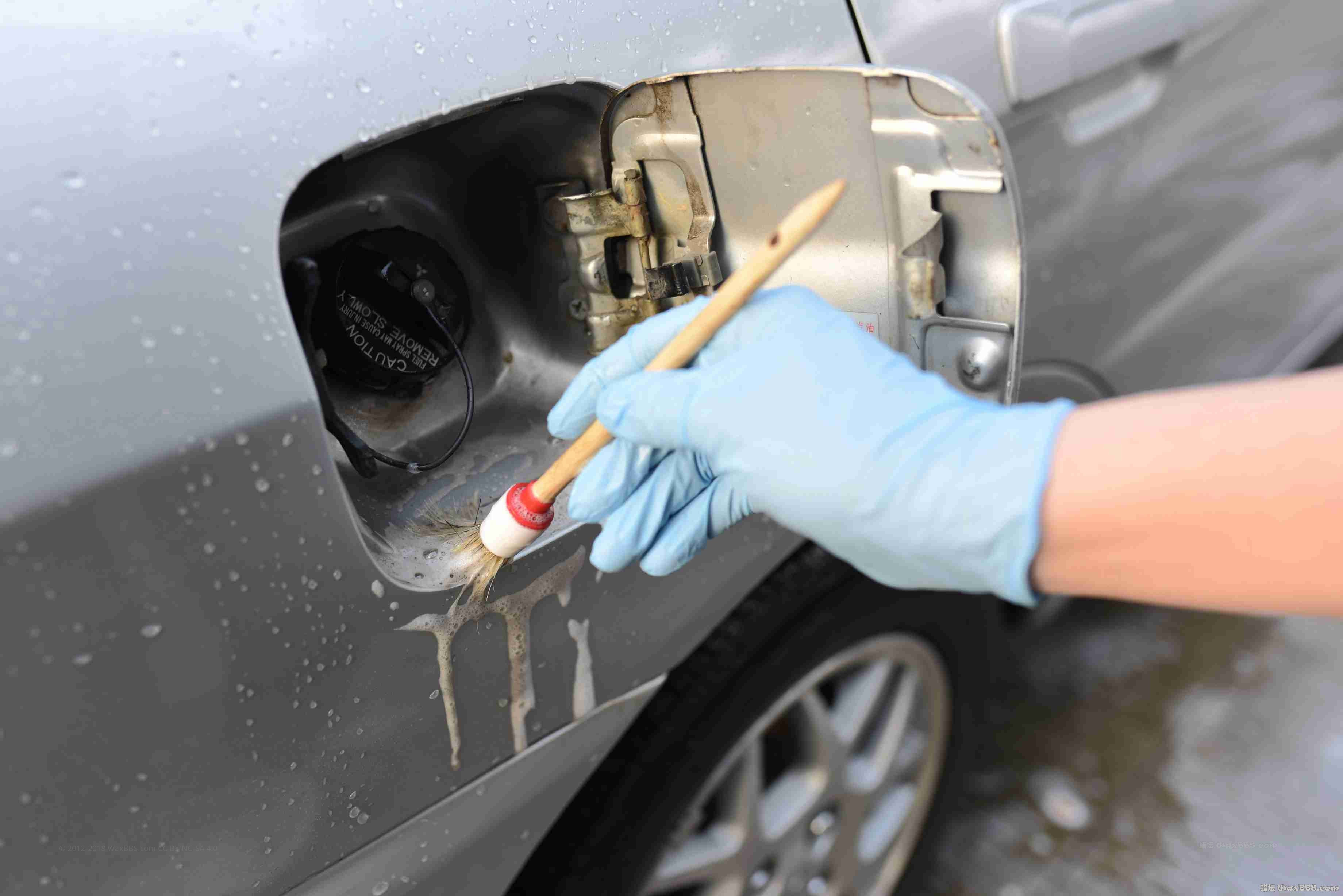 油箱盖内使用细节刷沾取洗车液清洗后冲水。